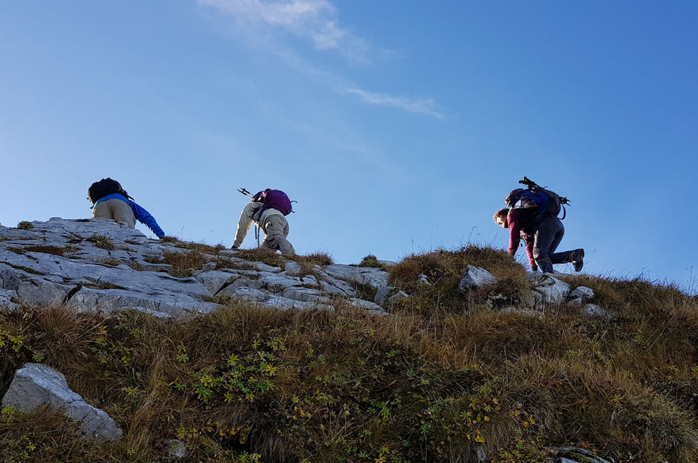 Nous poursuivons ensuite notre circumambulation vers le col de Floray et son arête. Le panorama, bien nuageux, s’ouvre sur les dents du Midi plâtrées de neige et le massif du Mont-Blanc. Un long parcours de crête s’offre alors à nous. Après l’ascension express en aller-retour de la pointe de Bénévent (2069 m), nous poursuivons notre chevauchée en direction des chalets de Darbon où nous attend un petit cours d’histoire savoisienne professé par notre doyen Jean-Paul. Il nous faut alors remonter vers le col de la Case d’Oche au travers d’un beau vallon parcouru par de nombreuses chèvres au pied tout alpin. En guise de chörten pour nous accueillir, un ciel de plomb a recouvert le Léman augurant d’une rincée à venir.