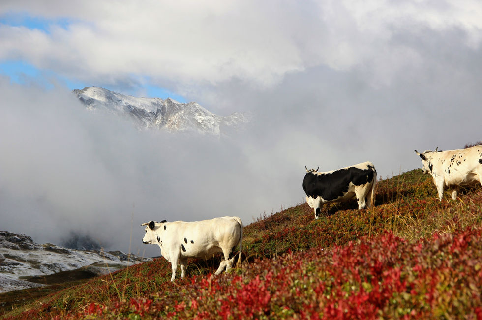 L’arrivée de ce visiteur étranger nous oblige à rebattre les cartes. Adieu est fait à la pointe Droset et à ses dalles rendues glissantes par la dame blanche. Nous jetons notre dévolu sur une jolie boucle montant au col de Sollières (2639 m), puis au mont Froid (2822 m) où journée du patrimoine oblige, nous visiterons son ancien fort, puis le col de Bellecombe et retour au refuge. Si cette variante au programme initial ne présente pas de difficulté, elle nous plonge dans un monde féérique fait de camaïeu de rouge, de violet, d’orange… rehaussé par le blanc cristallin de cette première neige d’automne. Vaches, ruines, alpage, marmotte, tout prend une autre dimension dans ce décor. Le réflexe crépite à tout va, ne voulant laisser échapper une parcelle de magie…