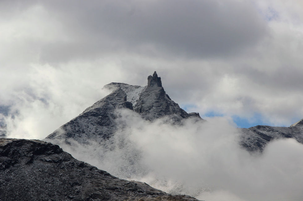 Tout occupé à notre progression, nous ne prêtons pas attention aux nuages qui progressivement se referment sur nous. L'ambiance devient ainsi de plus en plus haute montagne, le sentier qui serpente au milieu de pentes très minérales de l'arête Sud, prenant des airs de cinéma hitchcockien.