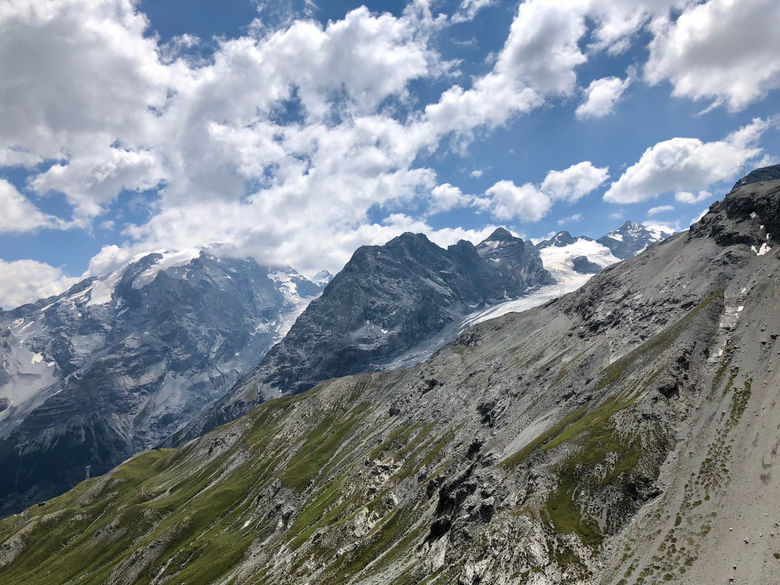 C’est avec une certaine émotion que nous parcourons les vestiges de ce passé tragique, presque 100 ans jour pour jour avant la fin du conflit. Du col nous montons au refuge Garibaldi situé à la place de l’ancien hôtel autrichien en territoire helvète de la Drei-Sprachen-Spitze. Puis, nous longeons le vide sur une large crête où la vue porte loin. Une dernière traversée à flanc nous permet d’atteindre un col d’où nous remontons en direction du sommet. Une vue somptueuse s’offre à nous de la Bernina au Piz Buin en passant par les pics acérés du massif de l’Ortler, triste rappel des baïonnettes des soldats de la Grande Guerre.